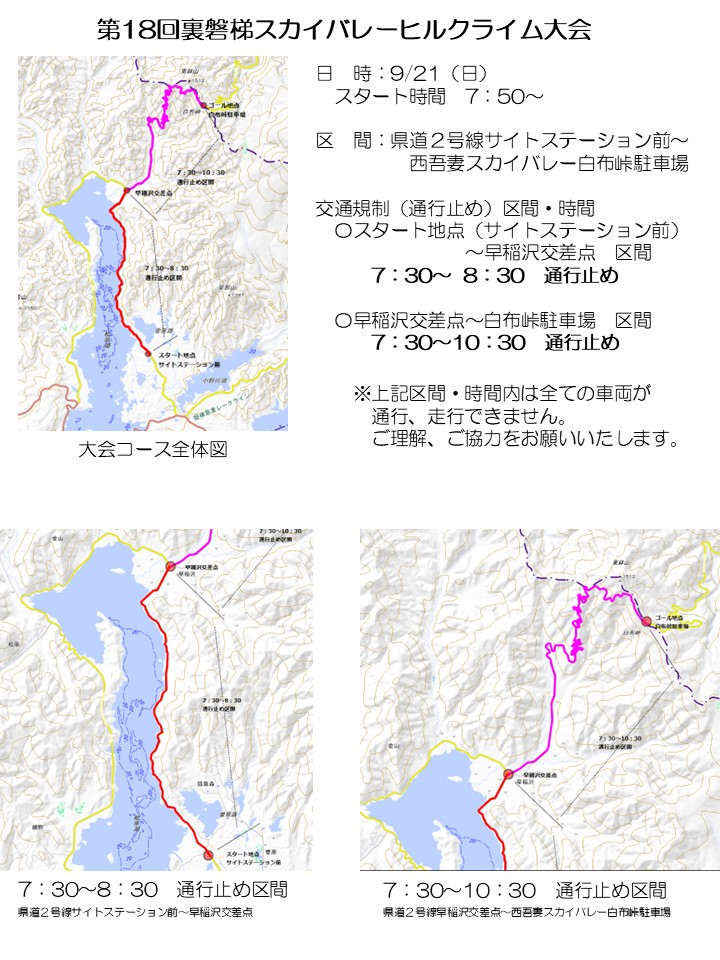 大会コースとなる、県道2号線サイトステーション前から西吾妻スカイバレー白布峠駐車場間で時間通行規制が行われます。