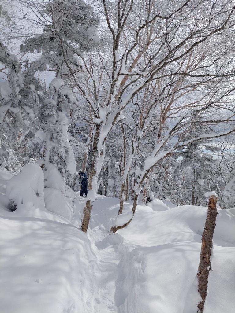 先日2日間ほど吹雪いた日があったので、パウダー・吹き溜まりがあるかと期待して、上へ上へとリフトで登ります。