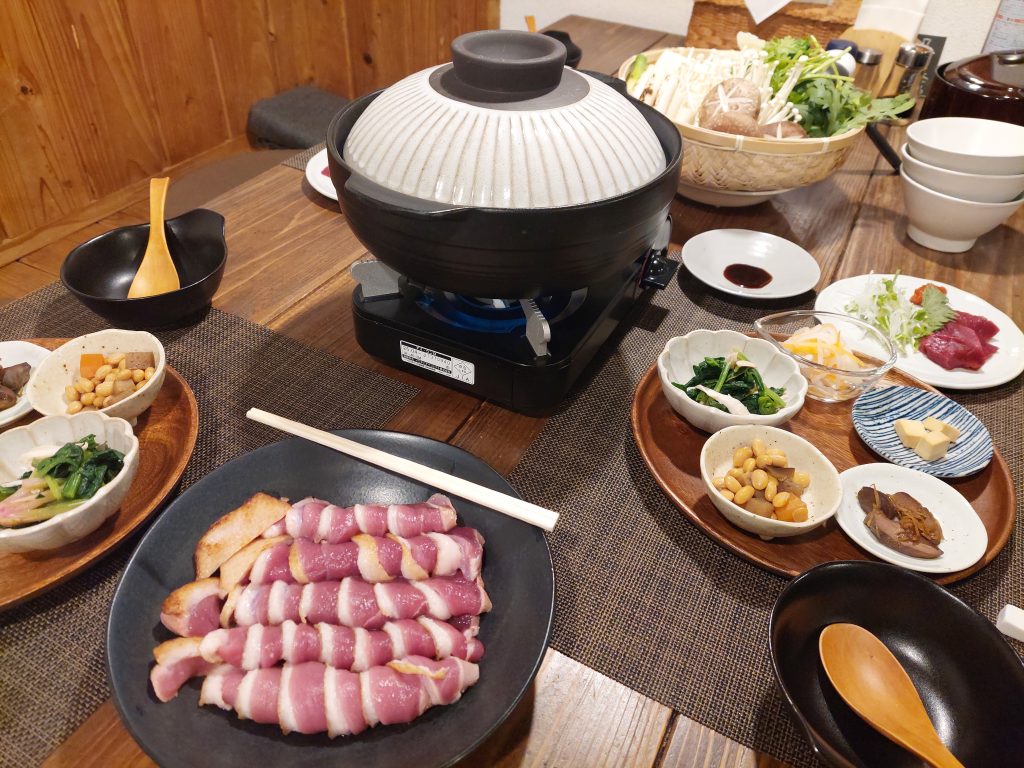 お夕食時は、鴨鍋会津名産の馬刺しと一緒に、福島の日本酒利き酒のご注文も♪